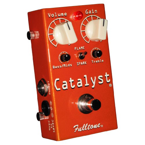 The Fulltone Catalyst distortion pedal is like three units in one pedalboard-friendly stompbox! You get totally cool fuzz tones that be easily switched to more conventional distortion tones. Plus, you get totally useful clean boost utility (great for pumping up those leads or maximizing other effects in the signal chain) and a great-sounding overdrive — all from a useful little box that's astoundingly really simple to use at home, onstage, or in the studio. The Catalyst features a completely brain-dead really simple control layout, with large Volume and Gain knobs, smaller Bass/Mids and Treble knobs, and a Flame/Spark switch that lets you effortlessly move from fuzz to crunch. You can transform your amp rig with one pedal; all you need is a Catalyst!